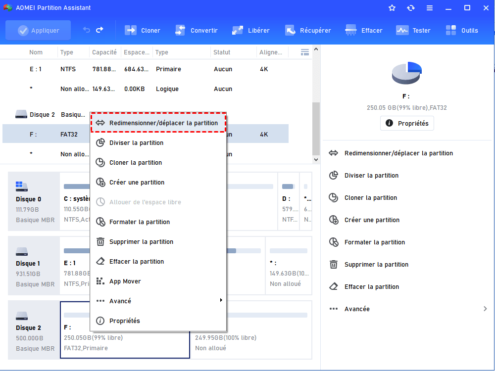 Note : Si votre disque dur a des partitions chiffrées, vous pouvez également redimensionner ces partitions.
