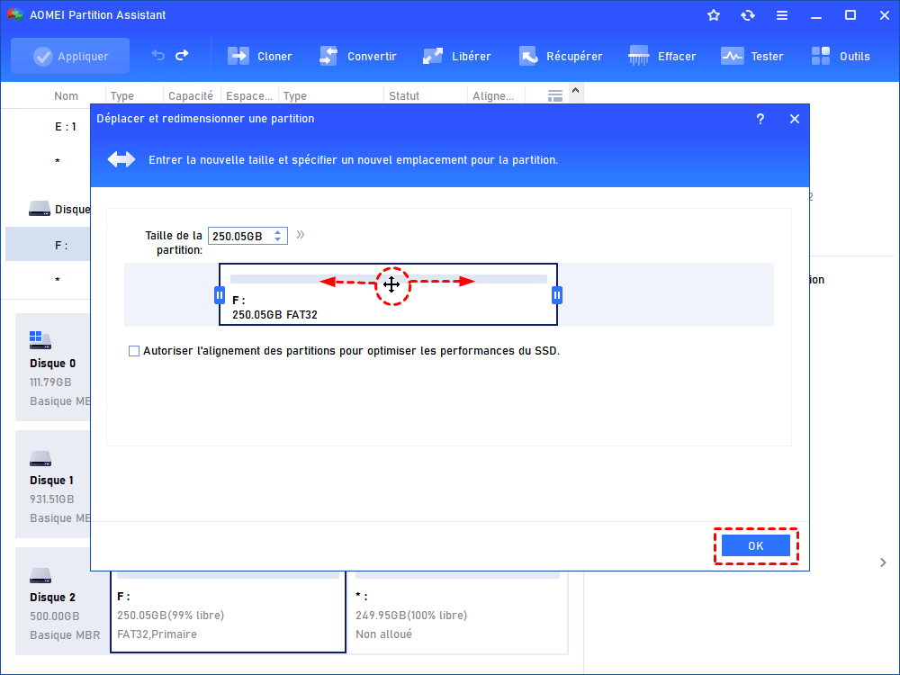 3. Faites glisser la double flèche vers la droite pour étendre la partition à 500 Go. Cliquez sur OK pour continuer.