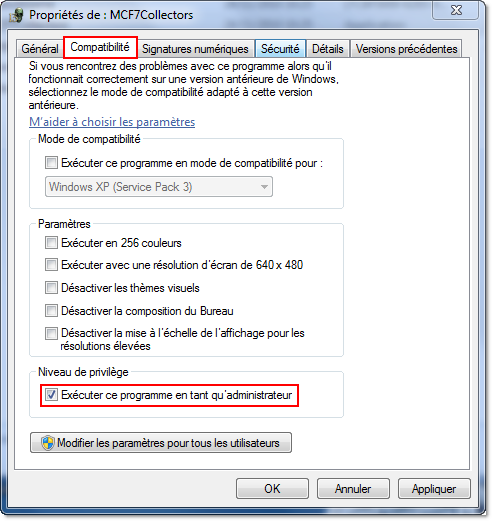 2. Allez dans l'onglet Compatibilité.