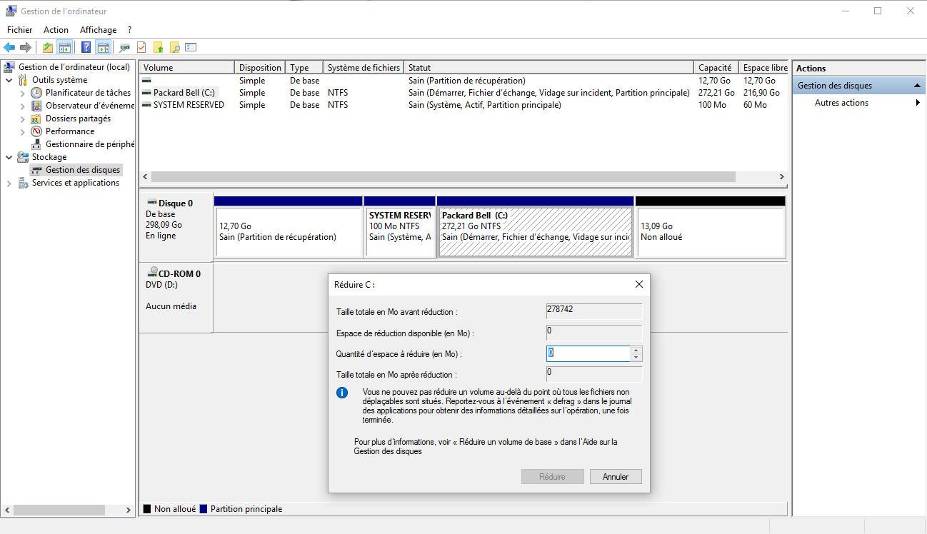 Lorsque vous réduisez le volume de disque dur, la quantité d'espace à réduire s'affiche 0 Mo. Selon le message d'avertissement, vous ne pouvez pas réduire un volume au-delà du point où tous les fichiers non déplaçables sont situés. Il y existe donc des fichiers inamovibles (fichiers d'échange ou fichiers système) à la fin de la partition que vous essayez de réduire.
