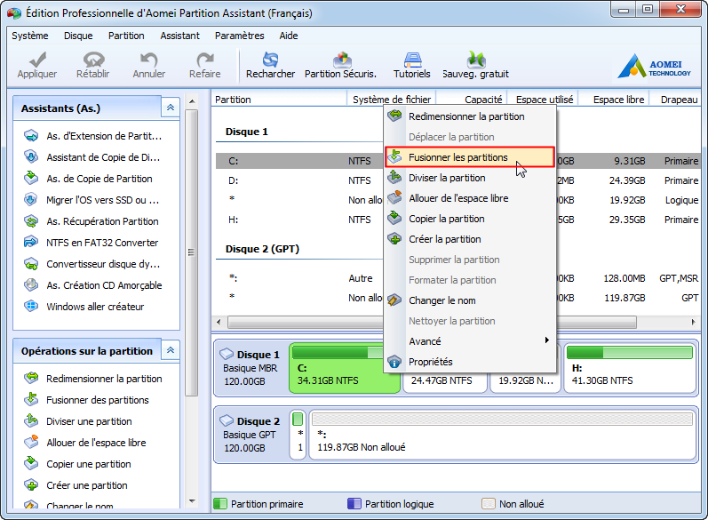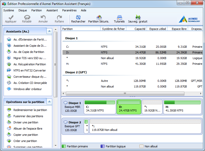 Gestion des disques est un bon gestionnaire des disques, mais il contient aussi des limitations. AOMEI Partition Assistant est une excellente alternative, en même temps, il possède plus de fonctionnalités utiles pour gérer vos partitions du disque dur.