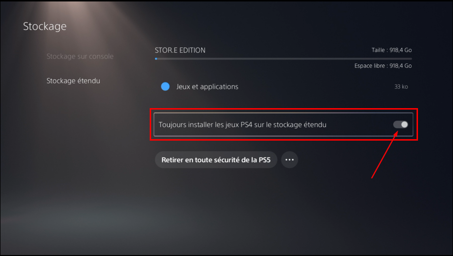 Une fois cela fait, activez l'option « Toujours installer les jeux PS4 sur le stockage étendu » si vous souhaitez installer automatiquement tous les jeux PS4 sur le disque dur externe.