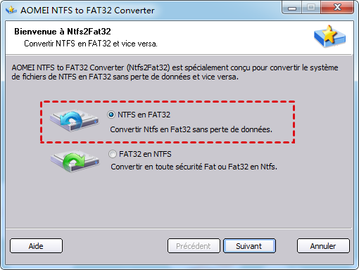 De plus, si le système de fichiers actuel du disque de 2 To est NTFS, vous pouvez convertir NTFS en FAT32 via AOMEI Partition Assistant. Cette fonctionnalité vous permet de convertir directement des systèmes de fichiers entre NTFS et FAT32 sans perdre de données.