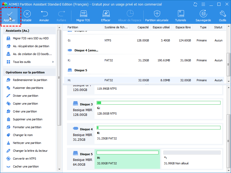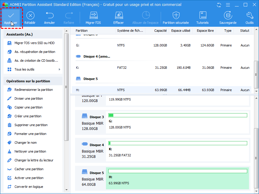En outre, AOMEI Partition Assistant vous permet de retirer le disque dur/ clé USB/carte SD en écriture protégé, déplacer la partition, étendre la partition, créer un support bootable, etc. L'édition professionnelle vous offre des fonctions plus avancées, telles que allouer d'espace libre, et ainsi de suite.