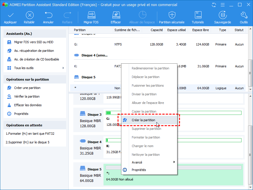 4. Puis faites un clic droit sur le disque dur chiffré BitLocker, selectionnez Créer une partition.