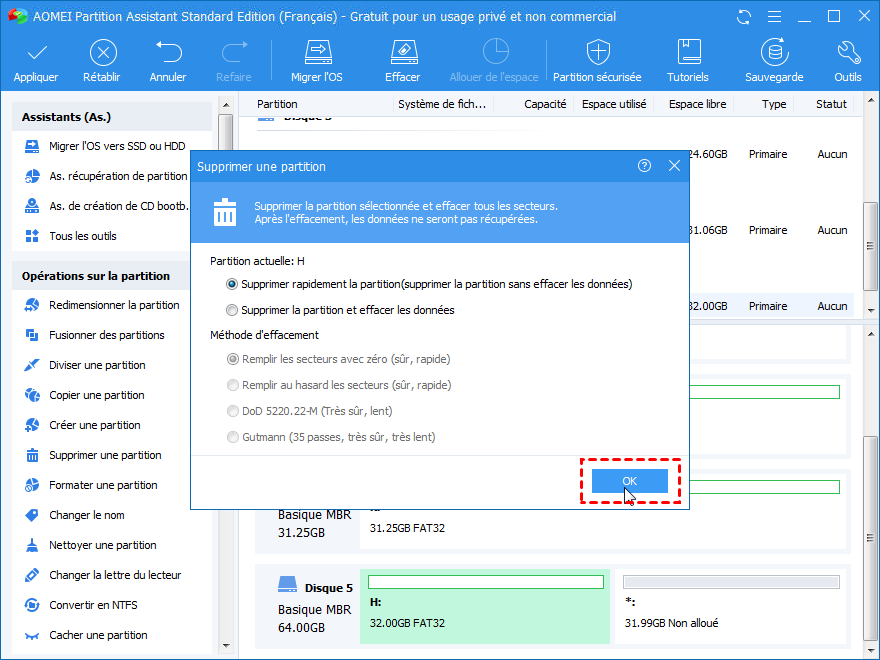 2. Selectionnez une méthode pour supprimer la partition, appuyez sur OK.