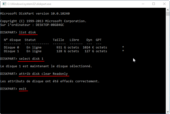 Notes : Dans le cas où vous devez protéger votre lecteur USB de la modification à l'avenir, vous pouvez exécuter "Attributes Disk Set ReadOnly" pour activer la protection en écriture.