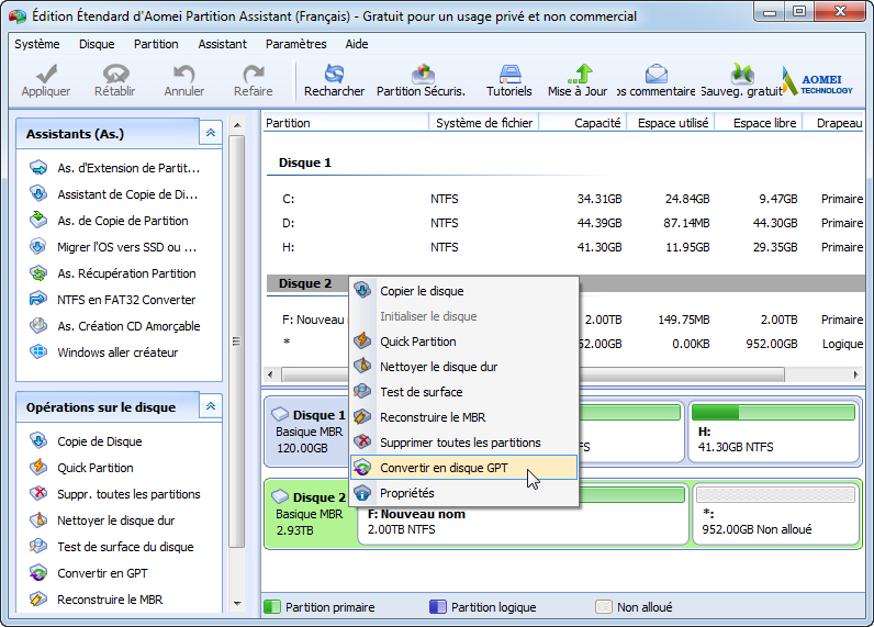 Ensuite, vous pouvez étendre les partitions au-delà du 2 To avec Diskpart, certainement, vous pouvez également utiliser AOMEI Partition Assistant pour étendre la partition.