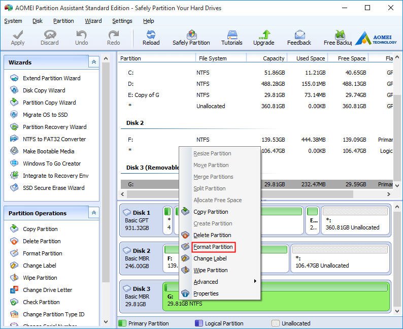 En plus du formatage de la carte SD pour un système de fichiers différent, AOMEI Partition Assistant vous permet également de formater un disque dur et une clé USB protégé en écriture, réparer la clé USB RAW, etc.