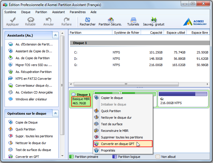 Étapes pour convertir un disque GPT en MBR avec AOMEI Partition Assistant :