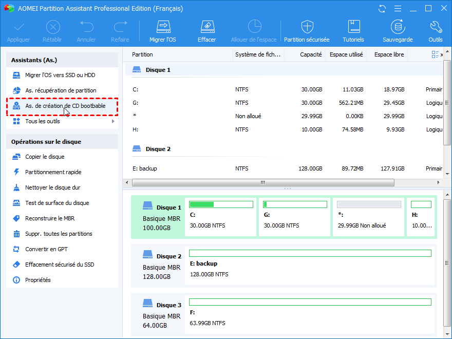 Si vous ne possédez pas de disque d'installation Windows 7/8/10/11. AOMEI Partition Assistant Professional vous aidera. AOMEI Partition Assistant est un logiciel tout-en-un développé par AOMEI Technology, reconnu pour ses performances exceptionnelles en gestion de disques et de partitions. Il s'agit également d'un outil de réparation système, capable de réparer les MBR endommagés ainsi que les fichiers système corrompus.
