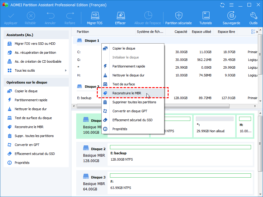 4. Lorsque l'ordinateur démarre à partir de la clé USB, AOMEI sera chargé automatiquement. Cliquez avec le bouton droit sur le disque système que vous souhaitez réparer et choisissez Reconstruire le MBR.