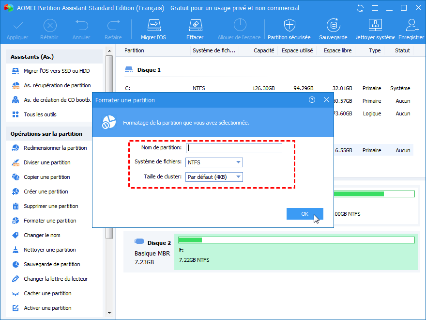 En plus des outils intégrés Windows, le logiciel AOMEI Partition Assistant peut vous aider à formater la carte SD protégée en écriture d'une manière facile, et aussi pour la clé USB et le disque dur protégés en écriture. Les étapes détaillées sont comme suit :
