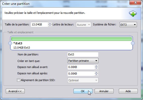 Étape 4 : Dans la fenêtre pop-up, cliquez sur Système de fichiers pour choisir EXT2 ou EXT3, puis cliquez sur Avancé si vous voulez nommer la partition (voici Ext3). Enfin, cliquez sur OK.
