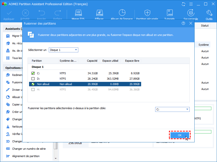 ★Remarque : S'il n'y a pas d'espace non alloué sur le disque dur, AOMEI Partition Assistant peut aussi vous aider à fusionner la partition C et la partition D.