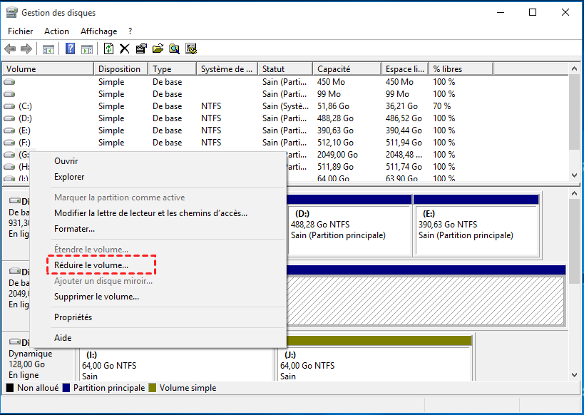 2. Faites un clic droit sur le volume existant sur le disque dur portable, choisissez Réduire le volume dans le menu déroulant, et suivez l'assistant de réduction de volume pour réduire la partition afin d'obtenir de l'espace non alloué ou de l'espace libre.