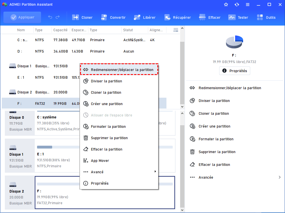 Si votre disque dur est NTFS et dépasse 32 Go, ne vous inquiétez pas. AOMEI Partition Assistant Standard Edition vous permet de convertir en NTFS et FAT32. Par rapport à la Gestion de disque intégrée de Windows, il brise la limitation. Il a également d'autres fonctions gratuites, comme déplacer la partition, vérifier la partition, redimensionner la partition, etc.