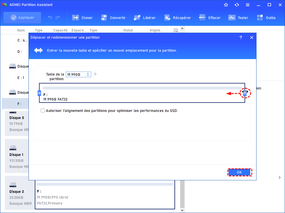 Étape 3. Faites glisser le pointeur de la souris vers la gauche pour libérer de l'espace non alloué. Cliquez ensuite sur OK.