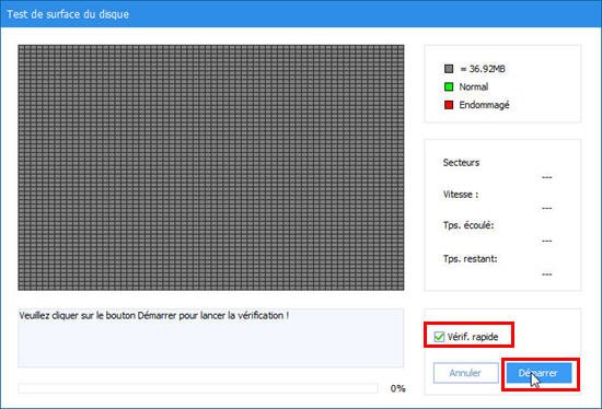 Étape 2. Vous pouvez vérifier rapidement chaque secteur sur le disque dur. Si le secteur est endommagé, il sera marqué comme une boîte rouge. Cochez l'option Vérif. rapide, puis cliquez sur Démarrer.