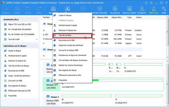 Si la reconstruction de MBR ne peut pas encore résoudre le problème qu’il n'y a aucun disque fixe à afficher, vous devez examiner s'il y a des erreurs sur le disque dur physique. Ensuite, vous pouvez utiliser AOMEI Partition Assistant pour tester votre disque dur.