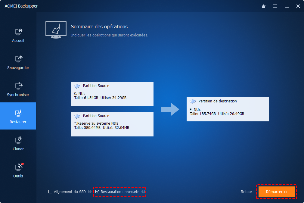 Sauvegardez le disque source sur un périphérique de stockage externe à l'aide d'AOMEI Backupper. Ensuite, créez un média de démarrage AOMEI pour démarrer l'ordinateur cible, après, restaurer la sauvegarde vers le disque dur de destination en activant l'option Restauration universelle.