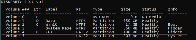 6. Vérifiez que la partition EFI utilise le système de fichiers FAT32 et attribuez une lettre de lecteur à cette partition, tapez et exécutez ces commandes :