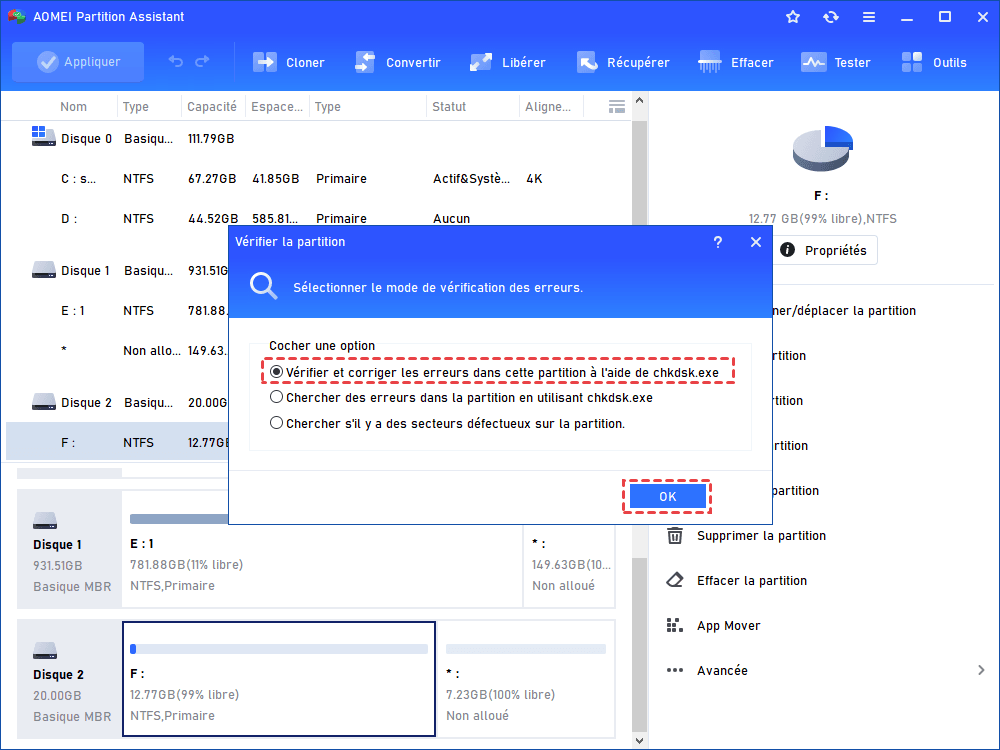 Comme mentionné ci-dessus, CHKDSK a de nombreux paramètres, et il est difficile de tous les retenir. La saisie de mauvaises commandes peut entraîner des opérations erronées et des erreurs système. Par conséquent, nous vous présentons un logiciel alternatif de Windows CHKDSK, AOMEI Partition Assistant. Il peut aussi réparer le disque dur externe/interne avec CHKDSK, avec son interface graphique, vous n'avez pas besoin de saisir de différentes commandes compliquées.