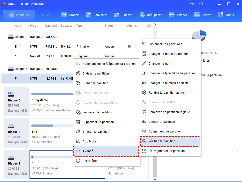 Étape 1 : Téléchargez, installez et exécutez AOMEI Partition Assistant. Faites un clic droit sur la partition que vous souhaitez vérifier et sélectionnez Avancé > Vérifier la partition.