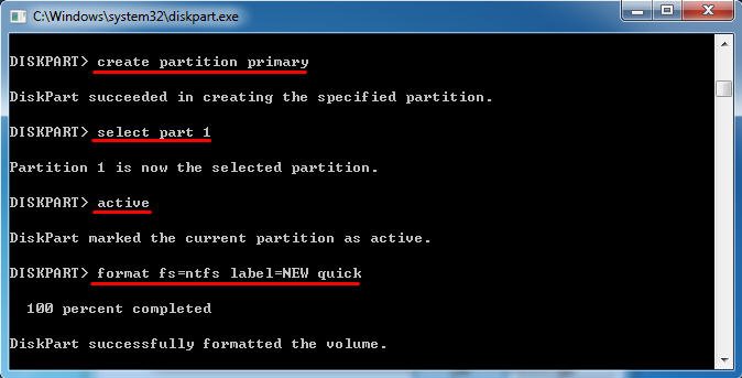 format fs=ntfs label=new quick (new peut être remplacé par un autre nom désiré)