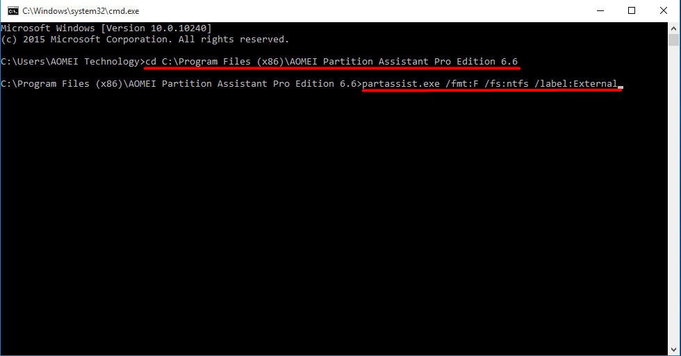 2. Tapez : partassist.exe /fmt: F /fs: ntfs /label: External et appuyez sur Entrée. C'est pour formater la partition F en NTFS et indiquer le nom de la partition comme External.