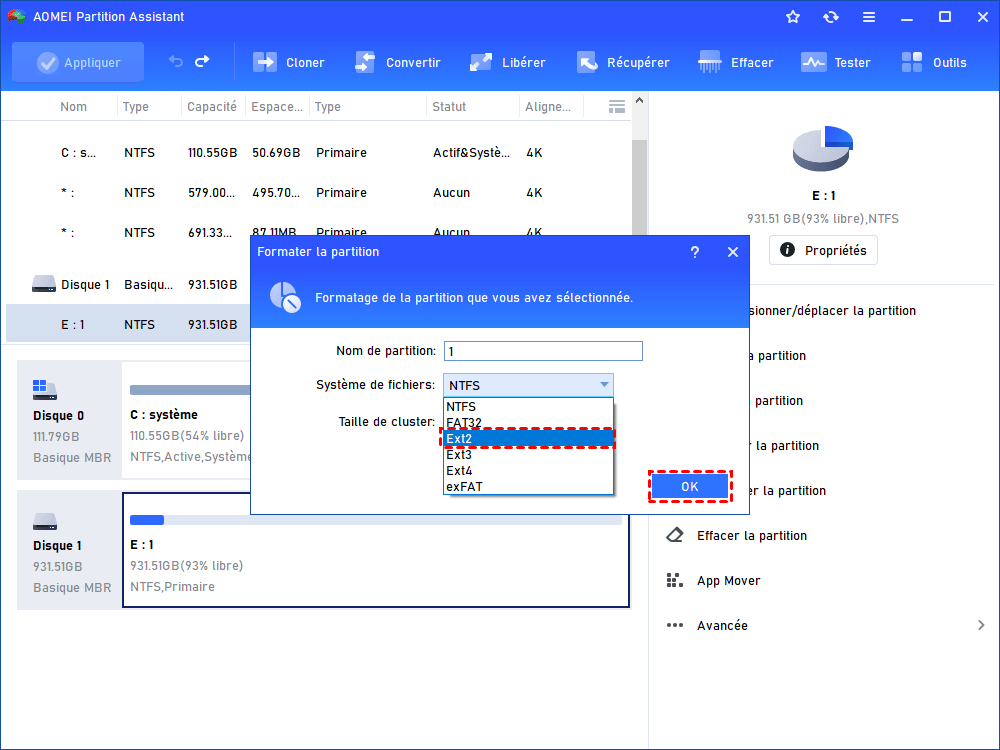 Étape2. Dans la fenêtre pop-up, choisissez l'un de ces systèmes de fichiers en fonction de vos besoins et cliquez sur OK.