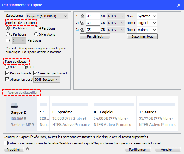 Comme indiqué, vous pouvez partitionner rapidement un disque dur en plusieurs partitions différentes simultanément. Cliquez avec le bouton droit sur le disque que vous souhaitez partitionner et sélectionnez Partition rapide dans la liste donnée. Vous verrez une fenêtre ci-dessous. Configurez chaque partition comme vous le souhaitez.