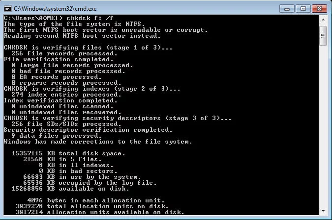 2. Tapez « chkdsk f: / f », où le premier « f » est la lettre de lecteur de la partition Samsung SSD.