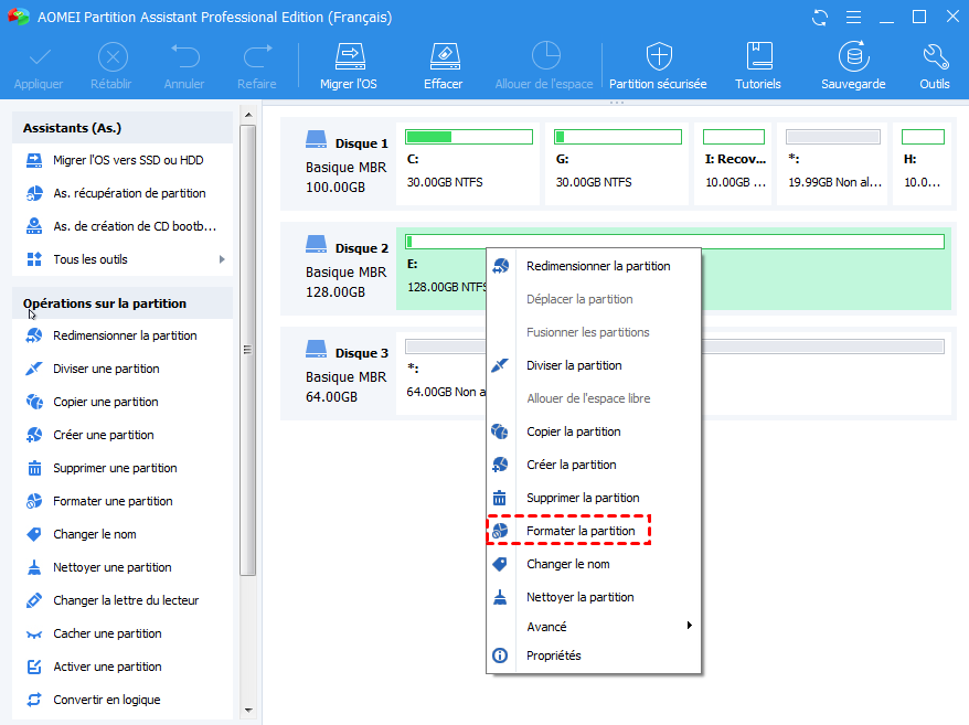 1. Téléchargez, installez et exécutez AOMEI Partition Assistant. Dans l'interface principale, cliquez avec le bouton droit de la souris sur la partition Samsung T3 SSD et choisissez Formater la partition.