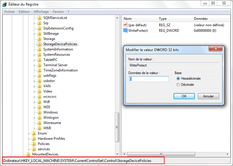 Attention : S'il n'y a pas d'option WriteProtect sous StorageDevicePolicies, vous pouvez créer une règle manuellement, la nommer et définir la valeur sur 0.
