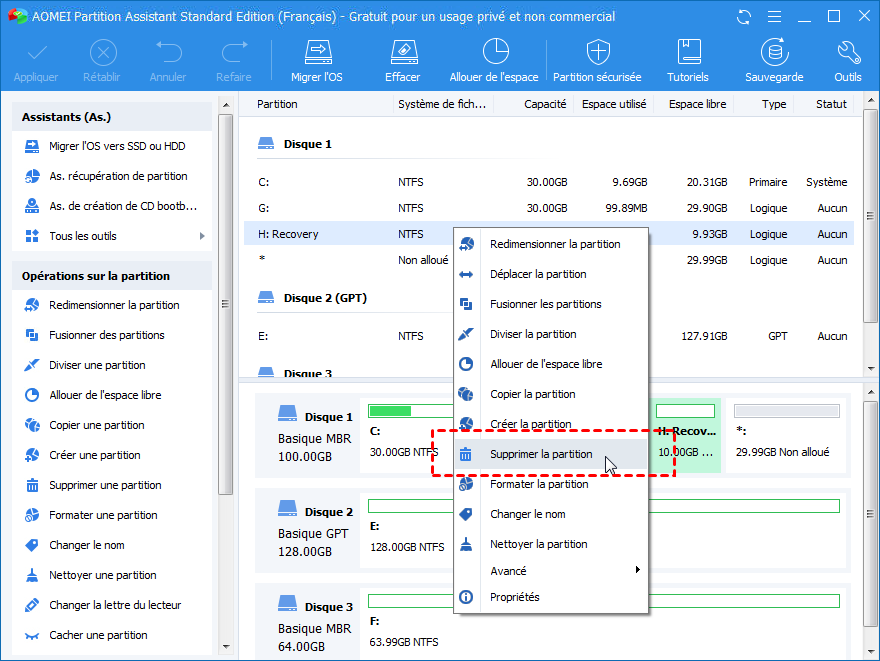 Un autre moyen de supprimer en toute sécurité la partition de récupération sur un ordinateur HP consiste à utiliser un puissant gestionnaire de partitions AOMEI Partition Assistant Standard. Il est gratuit et petit, sans logiciel publicitaire empaqueté. Il possède une interface utilisateur graphique pour les utilisateurs qui ne sont pas familiarisés avec les opérations en ligne de commande. Le nettoyage, la suppression et le formatage des données de partition sont disponibles à des fins différentes.