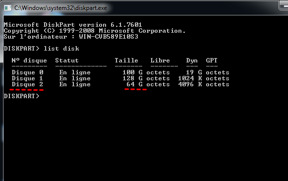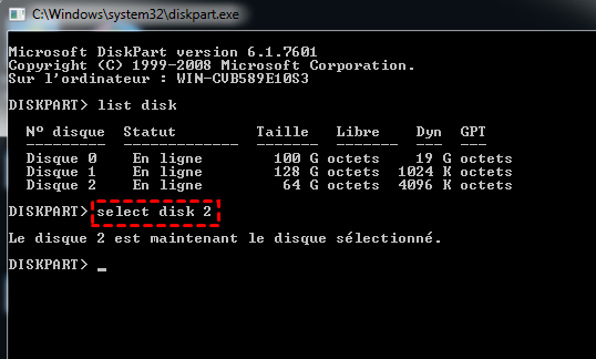 Étape 4. Vous devez identifier lequel est le lecteur USB, puis tapez select disk # (# fait référence au numéro de disque) → Entrée.