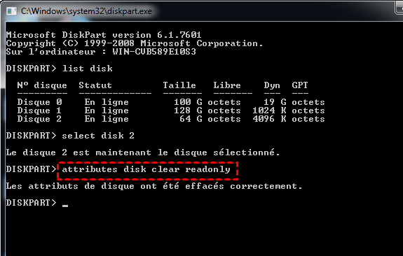 Étape 5. Tapez attributes disk clear readonly → Entrée.