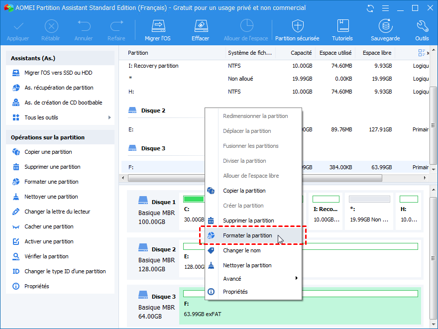AOMEI Partition Assistant est un logiciel professionnel qui vous aide à mieux gérer votre disque/partition. Comparé aux deux premières méthodes, vous constaterez qu’il est plus pratique de formater la clé USB Transcend protégée en écriture avec cet outil. Par ailleurs, il prend en charge Windows 7/8/8.1/10/11 32 bits et 64 bits.