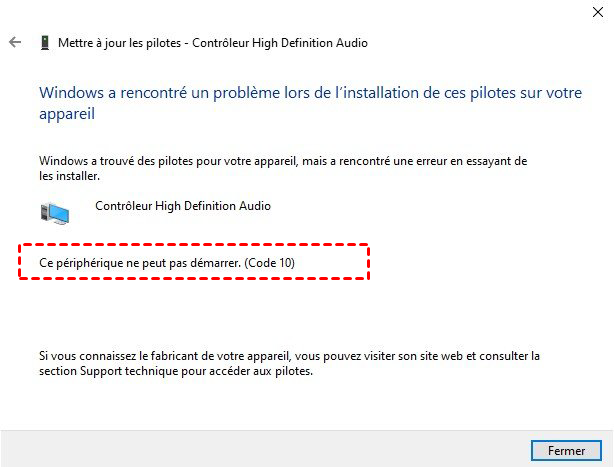 Causes courantes de l'erreur « Ce périphérique ne peut démarrer (Code 10) » :