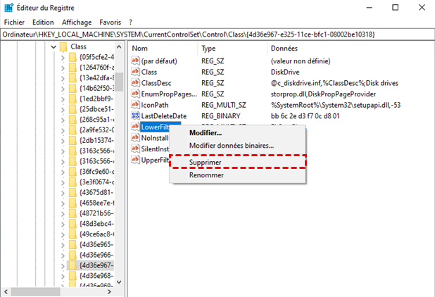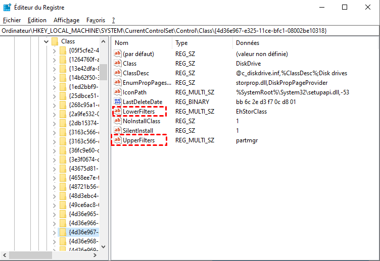 Étape 4. Localisez votre GUID de classe problématique dans la liste. Et vous pouvez voir « LowerFilters » et « UpperFilters ».