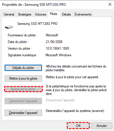 Étape 2. Sous l'onglet « Pilote », cliquez sur « Restaurer le pilote » > « OK ».