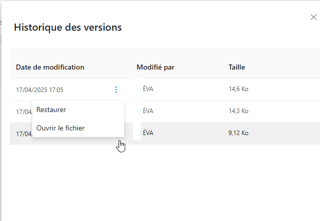 8. Pour restaurer une version antérieure, cliquez sur les trois points (...) à côté de la version souhaitée.
