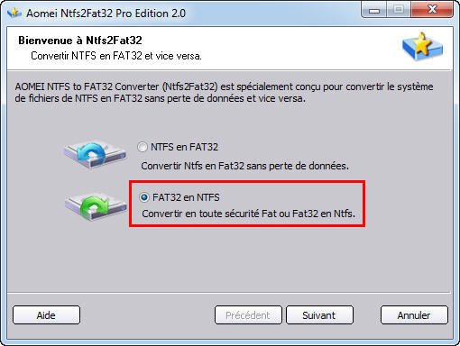 Étape 2. Choisissez la façon dont vous voulez convertir. Vous devez choisir FAT32 en NTFS dans ce cas.