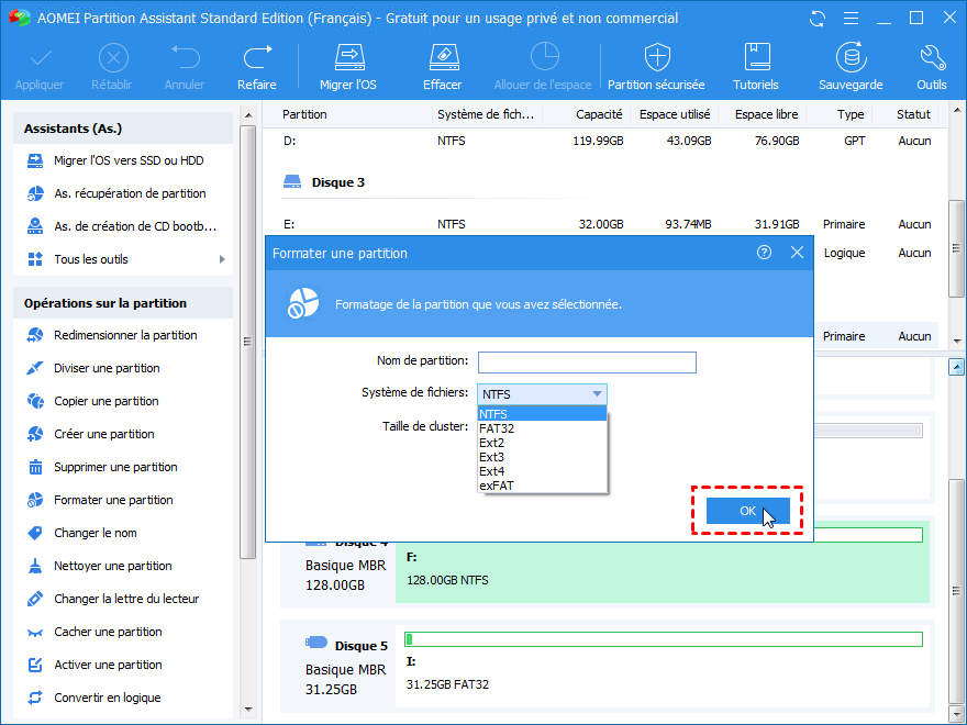 Si vous ne parvenez pas encore à obtenir les privilèges suffisants après toutes ces tentatives, il est judicieux d'effectuer des tâches par d'autres moyens. AOMEI Partition Assistant Standard est un gestionnaire gratuit de partition de disque dur qui gagne sa propre réputation dans la maintenance des disques. Il vous permet de formater le lecteur USB, la carte SD, le lecteur de stylo rapidement et efficacement. Et il peut effectuer des tests de surface du disque et la vérification de la partition, aucun privilège requis.