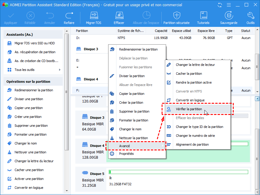 Étape 1. Dans AOMEI Partition Assistant standard, cliquez avec le bouton droit sur la partition que vous voulez vérifier et sélectionnez Avancé > Vérifier la partition.
