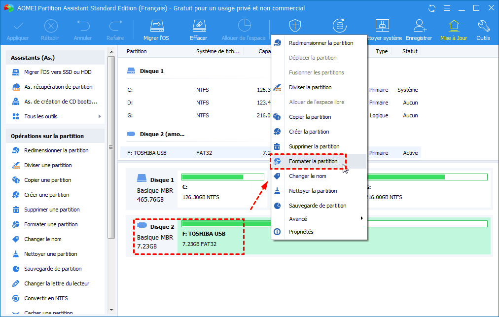 AOMEI Partition Assistant Standard est un logiciel gratuit de gestion de disque remarquable pour Windows 7, 8 ,10 et 11. Avec son interface intuitive, vous pouvez créer, redimensionner, supprimer, formater, déplacer et fusionner des partitions en quelques clics. Et le formatage d'une clé USB pourrait être beaucoup plus facile que celui avec Gestion des disques et Diskpart.