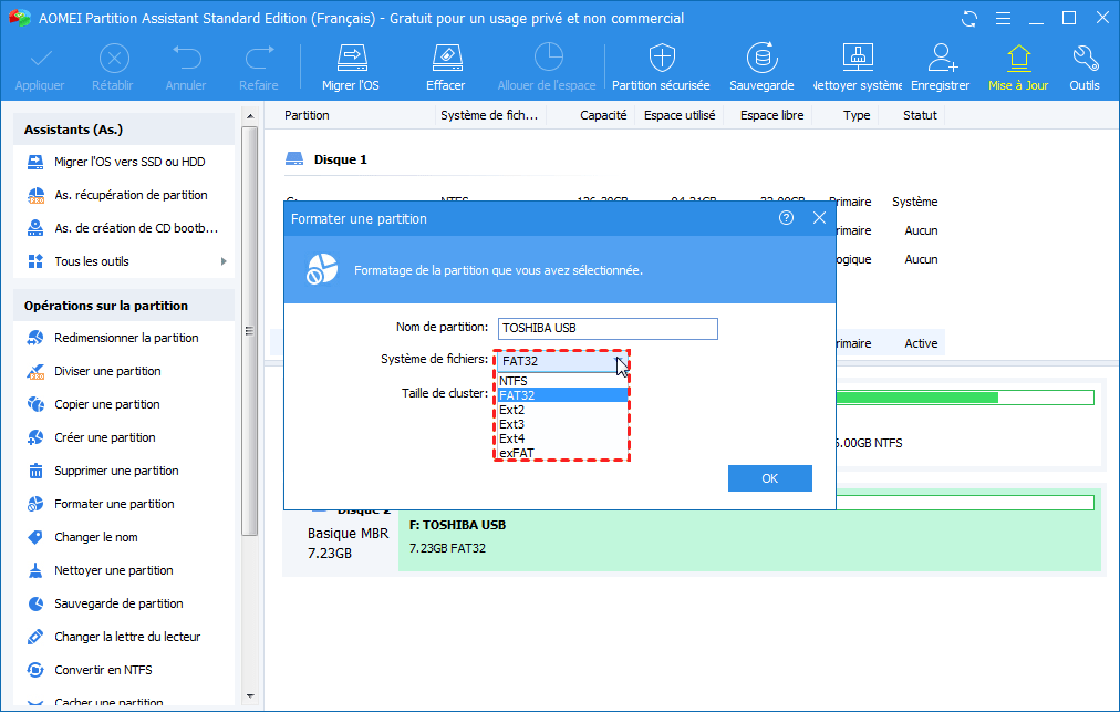 Lorsque Gestion des disques ne peuvent pas formater la clé USB, AOMEI Partition Assistant Standard est sans aucun doute un bon choix, il permet également de réparer un disque dur RAW en NTFS ou FAT32, ou convertir le système de fichiers de FAT32 en NTFS sans formater, etc.