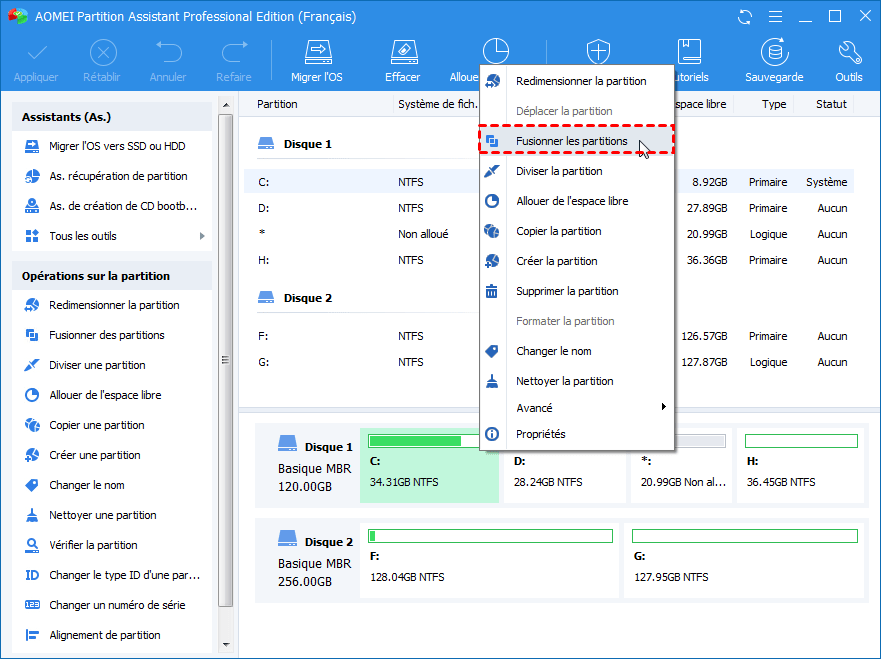 3> Le moyen le plus facile est d'utiliser Fusionner les partitions pour étendre votre partition malgré qu'il n'y a pas d'espace non alloué. Il vous faut cliquer avec le bouton droit sur la partition à étendre, et sélectionner Avancé -> Fusionner les partitions.