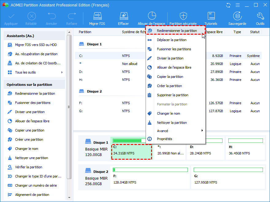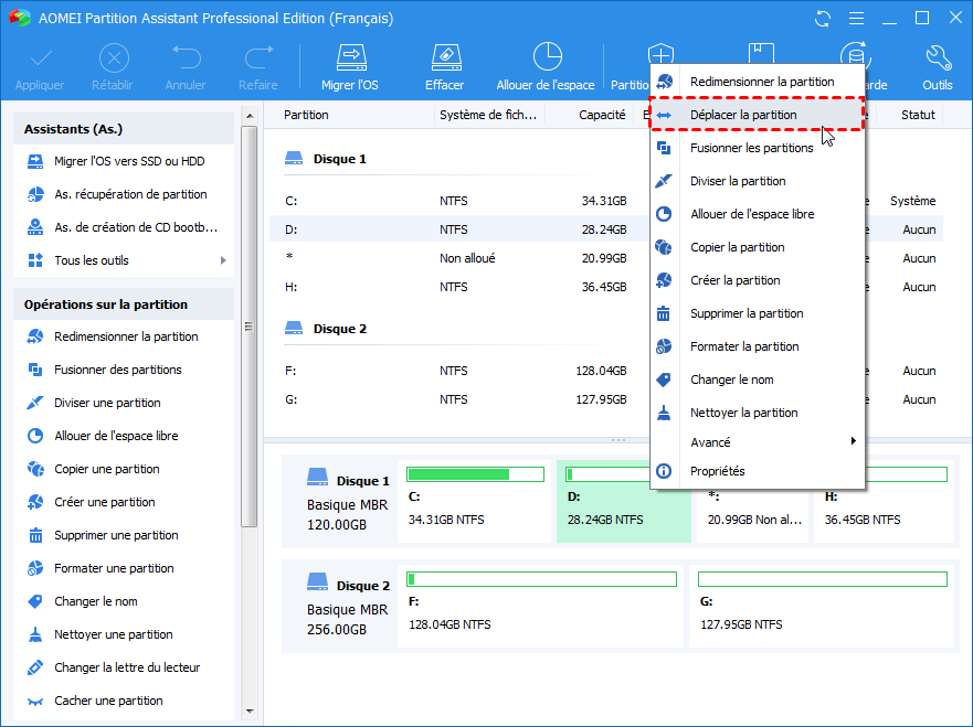 Téléchargez et lancez AOMEI Partition Assistant. Pour étendre une partition, vous pouvez le réaliser par déplacer la partition, redimensionner la partition ou fusionner deux partitions.